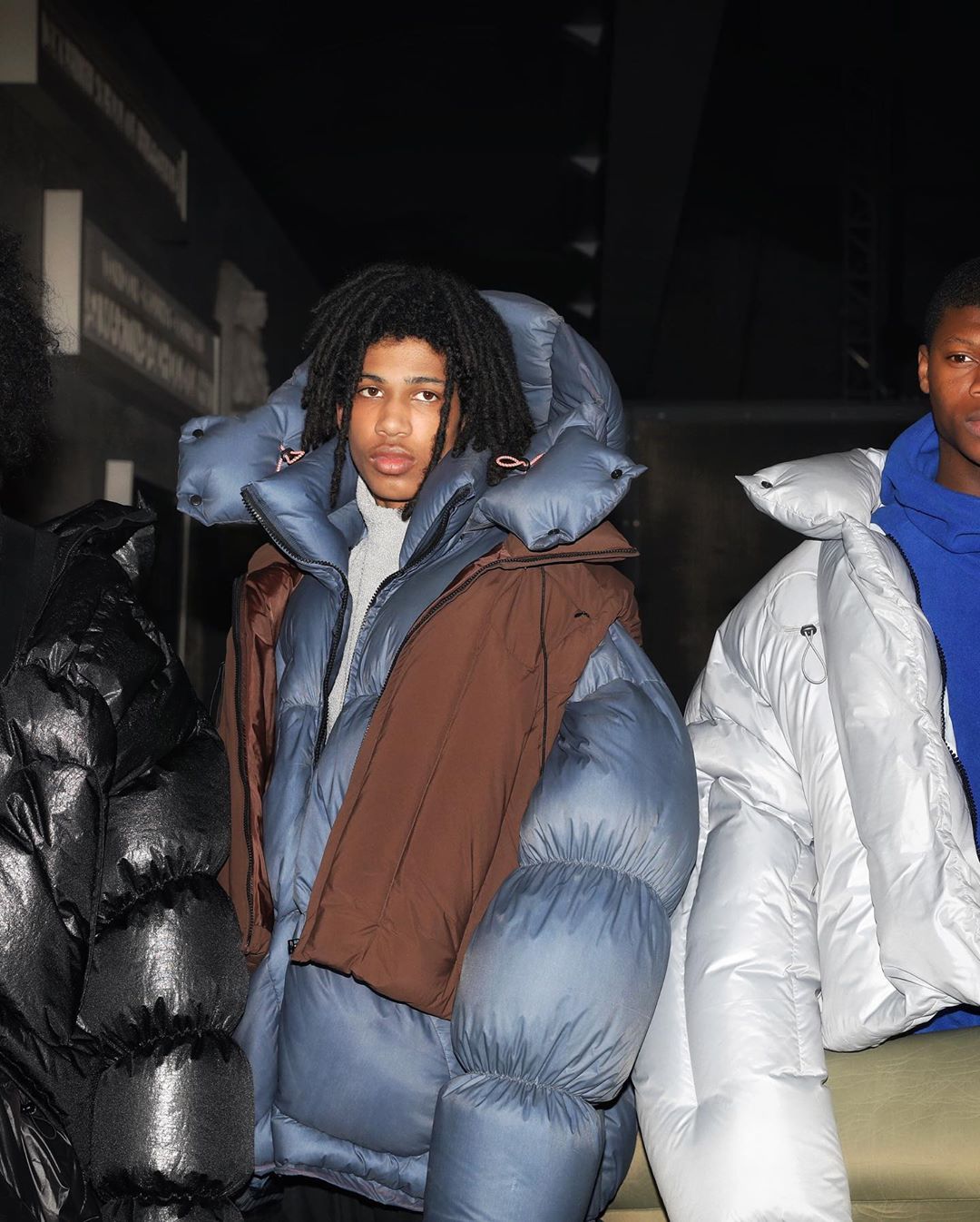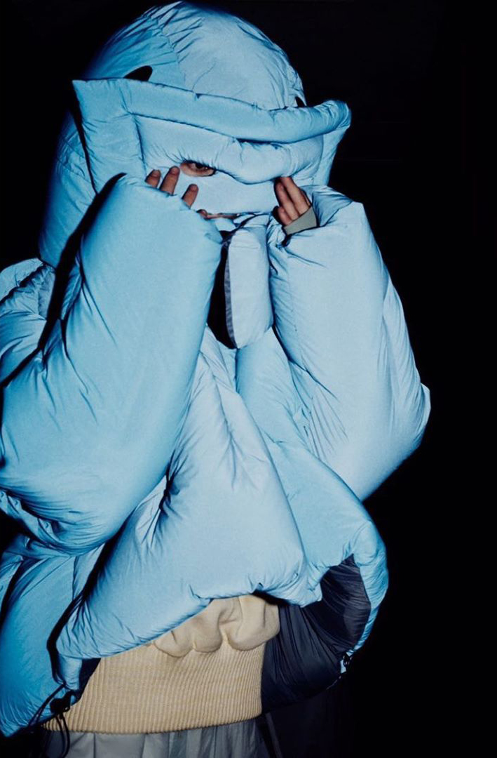 The amplified, pumped up proportions are super villain meets speed skier with helmet-like hoods.